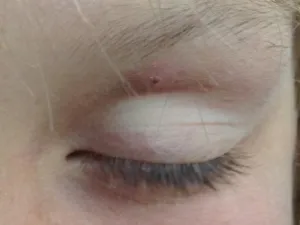 Parfois on peut observer le signe de la paupière (the eyelid sign), qui correspond à une piqûre de la paupière supérieure provoquant un œdème et un érythème de la paupière.