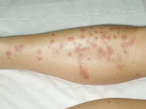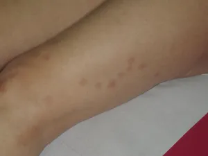 Parfois, l' éruption peut cependant être associée à une réaction systémique (générale) à type d' urticaire voire d' anaphylaxie. À contrario, certaines personnes ne développent pas de lésion, mais peuvent seulement constater de discrètes traces de sang dans le lit.