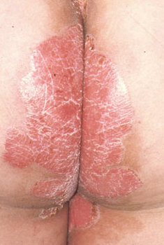 Dans cette forme de psoriasis, la localisation des lésions ne concerne pas les zones de frottement en relief, mais prédomine dans les plis (zones inversées) comme le pli inter-fessier, les plis inguinaux (racine des cuisses), les creux axillaires (sous les bras), les plis sous-mammaires (sous le sein) ainsi que l'ombilic. Les lésions sont ici plus inflammatoires que squameuses. Cette forme est trompeuse, parfois prise à tort pour une mycose.