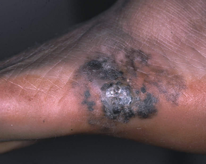 - Le mélanome acro-lentigineux touche les extrémités : les paumes, les plantes des pieds (sous forme de tache brune ou noire, parfois dépigmentée et aux contours irréguliers), ou les ongles (sous forme d’une bande noire irrégulière et acquise). Il apparaît sur des zones non exposées au soleil, lequel ne joue donc pas de rôle dans son apparition. Ce type de mélanome est le plus fréquemment observé chez les personnes à peau foncée ou d’origine asiatique, bien qu’il puisse également survenir chez les personnes à peau claire. Le diagnostic est souvent tardif, en raison d’une méconnaissance de cette forme de mélanome ou parce que la lésion est plus difficile à visualiser du fait de sa localisation lorsqu’il se localise sur la plante des pieds.