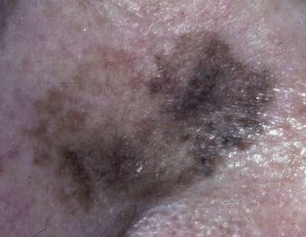 - Le mélanome de Dubreuilh se présente sous la forme d’une tache pigmentée inhomogène, allant du marron foncé au noir, ressemblant à une tache de vieillesse. Il s’étend très lentement, sur plusieurs années voire plusieurs décennies, principalement sur les zones exposées au soleil (notamment le visage) chez les personnes âgées, et passe souvent inaperçu. Il représente environ 10 % des mélanomes.