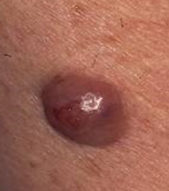 - Le mélanome nodulaire se manifeste d’emblée sous forme d’un relief. Il peut être de couleur noire, mais aussi parfois dépourvu de pigmentation. De consistance ferme, il peut s’ulcérer, se couvrir d’une croûte, suinter ou saigner. Ces mélanomes ont en général une croissance rapide (en quelques semaines), avec une extension verticale en profondeur. Les critères ABCDE sont souvent inadaptés à ce type de mélanome, à l’exception du « E » (évolution). Ils représentent 5 à 20 % des cas.