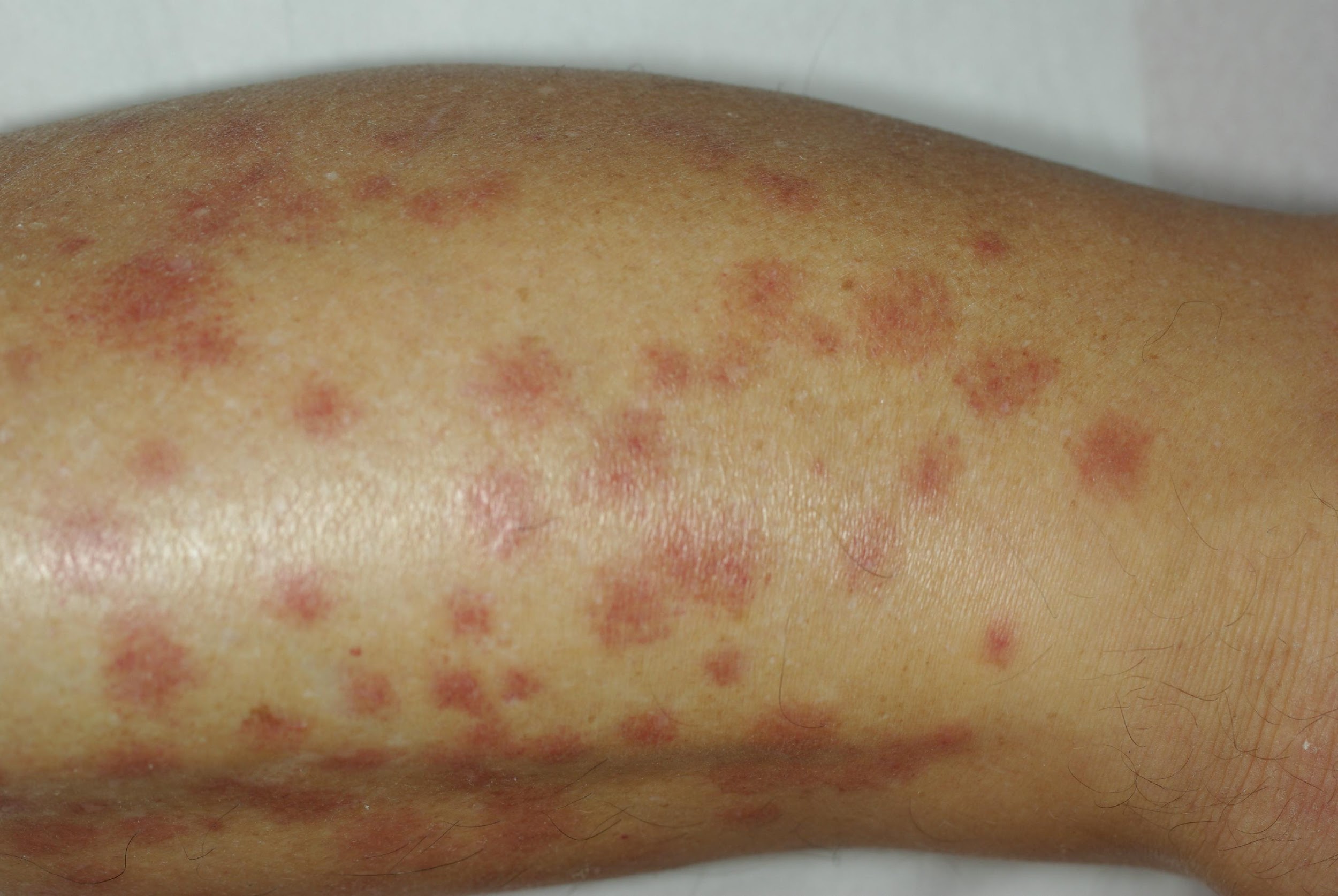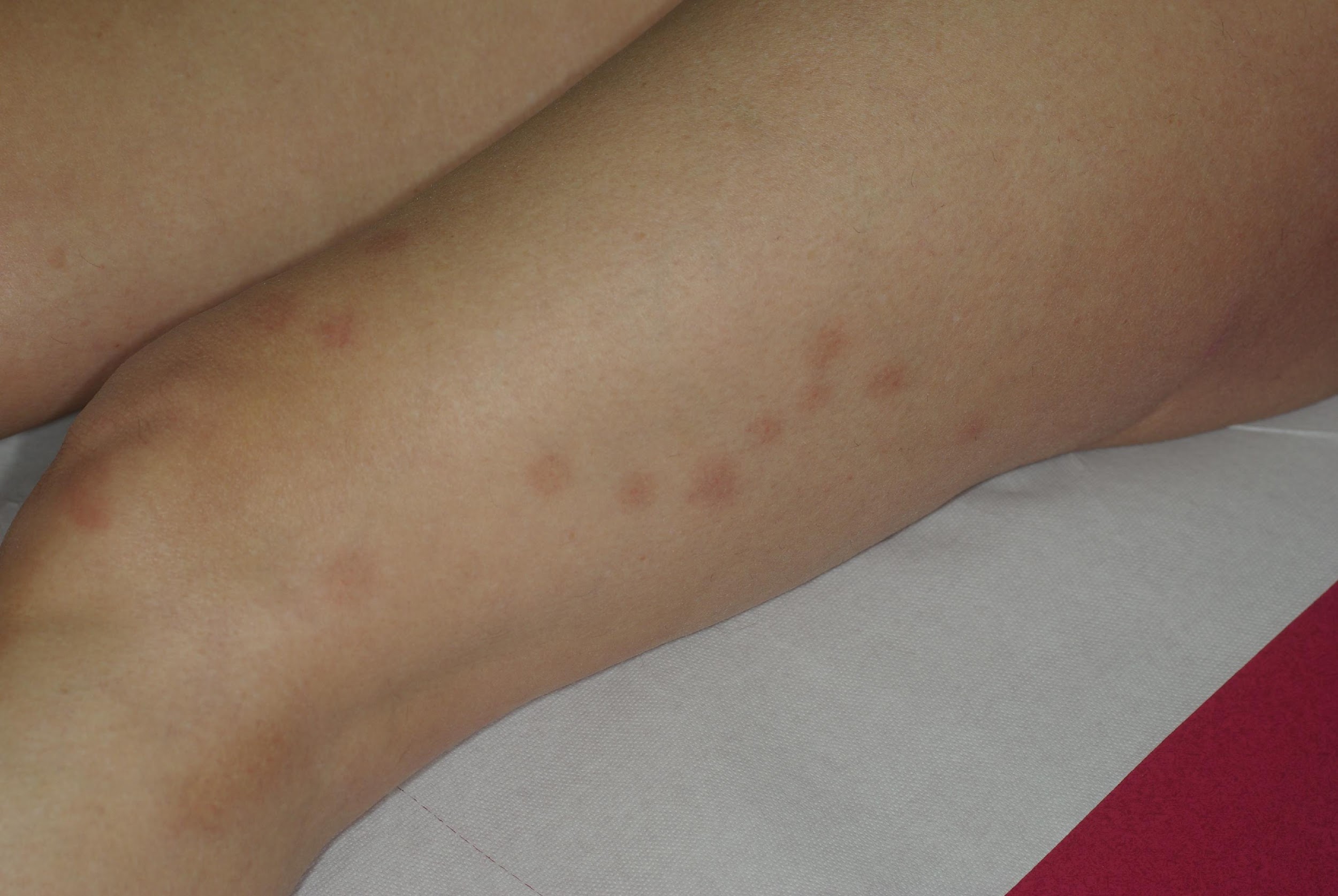 Parfois, l' éruption peut cependant être associée à une réaction systémique (générale) à type d' urticaire voire d' anaphylaxie. À contrario, certaines personnes ne développent pas de lésion, mais peuvent seulement constater de discrètes traces de sang dans le lit.