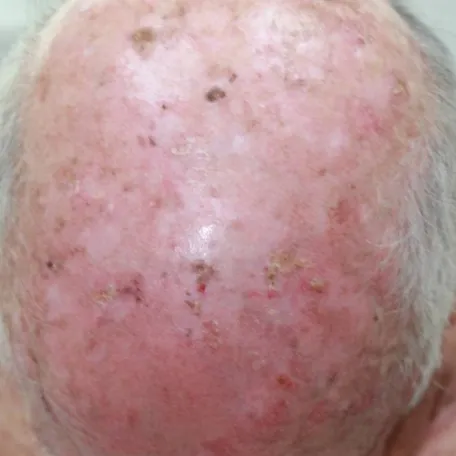 La kératose actinique se traduit par une lésion rouge et croûteuse, rugueuse au toucher et située principalement dans une zone exposée au soleil. Elle est parfois plus palpable que visible. Elle peut être unique ou au contraire multiple.