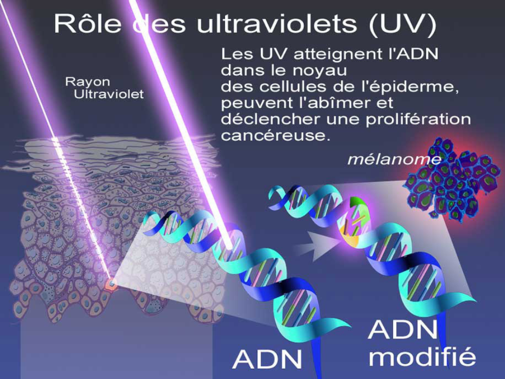 Les rayons ultraviolets agissent sur les cellules de la peau et brisent les chaînes d'ADN qui sont en permanence réparées par des enzymes. Mais ce mécanisme peut vite être débordé en cas d'exposition prolongée. Par conséquent, si les cellules de la couche basale, qui assurent le renouvellement cutané, sont atteintes, la production de mélanine, de collagène et d'élastine diminue : c'est l'élastose solaire. La peau devient sèche et moins élastique, elle se pigmente de petites taches, les rides sont plus marquées… Les excès de soleil accélèrent donc très nettement le vieillissement de la peau.