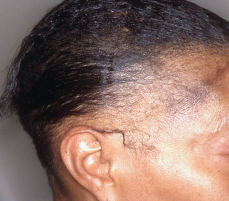 Les cheveux ont trop été tirés, et la perte de cheveux progresse du front et des tempes vers le haut du scalp. Les extensions de cheveux, en plus de tirer les cheveux, peuvent abîmer le cuir chevelu en provoquant des cicatrices et des pertes de cheveux irréversibles. Toutes ces méthodes de coiffage doivent être utilisées avec parcimonie, après avoir éventuellement demandé l'avis d'un dermatologue.