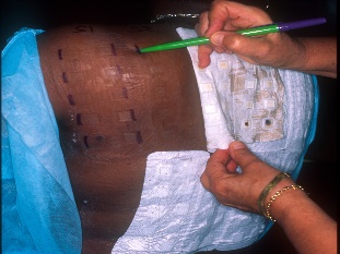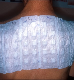 Dépose des patch tests après 2 jours de contact avec la peau et marquage des zones de tests
