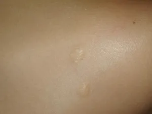 Les premiers signes sont généralement discrets : fièvre modérée, céphalées (mal de tête) puis apparition des premières macules (lésions en forme de lentille) rosées prurigineuses, rapidement surmontées par une vésicule (petite cloque). On parle parfois de goutte de rosée.