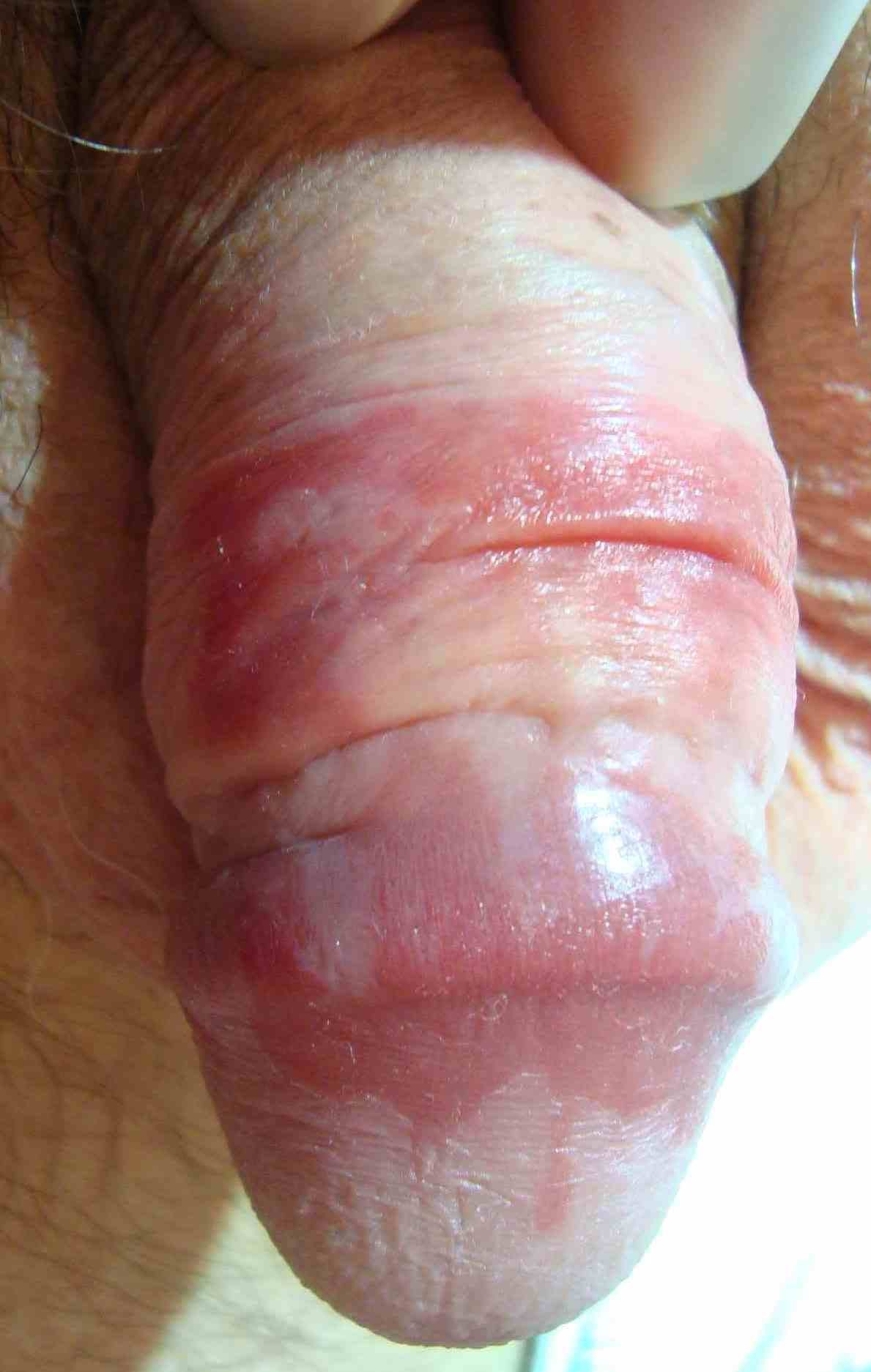Sur les organes génitaux, les lésions de psoriasis sont des plaques rouges aux limites nettes. Les squames blanches habituellement retrouvées sur les plaques du reste du corps sont souvent absentes du fait de l’humidité locale de la peau.