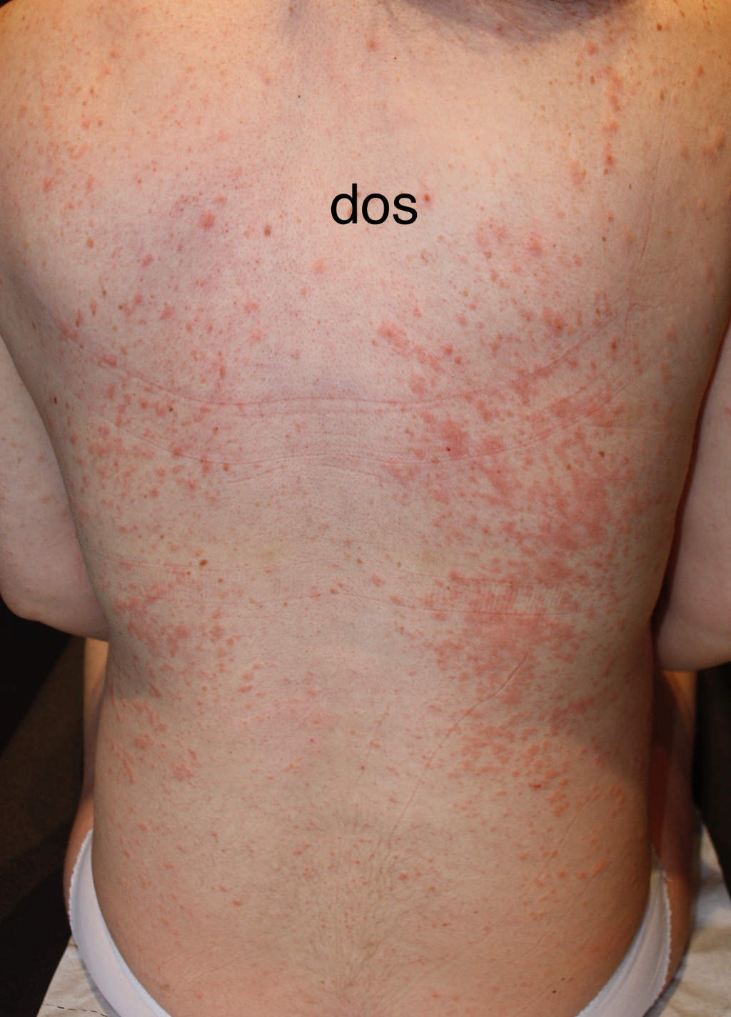 L' éruption est faite de petites papules roses ou rouges (taches en légère épaisseur), qui peuvent s' étaler et se rejoindre pour former des plaques, de plus grande taille.