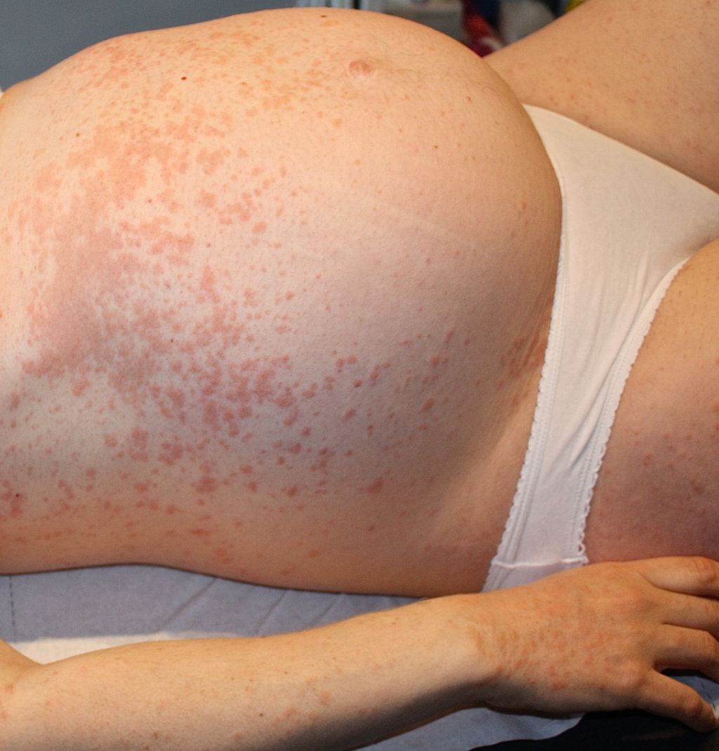 C' est une éruption qui débute en fin de grossesse (dans 80 % des cas après 34 semaines d' aménorrhée) ou bien juste après l' accouchement, le plus souvent au cours d' une première grossesse, mais pas uniquement.