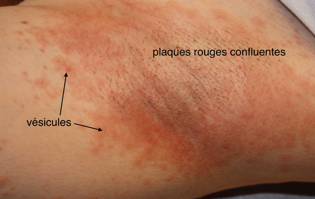 - est faite de petites plaques rouges qui ressemblent à de l' urticaire, elle démange beaucoup.