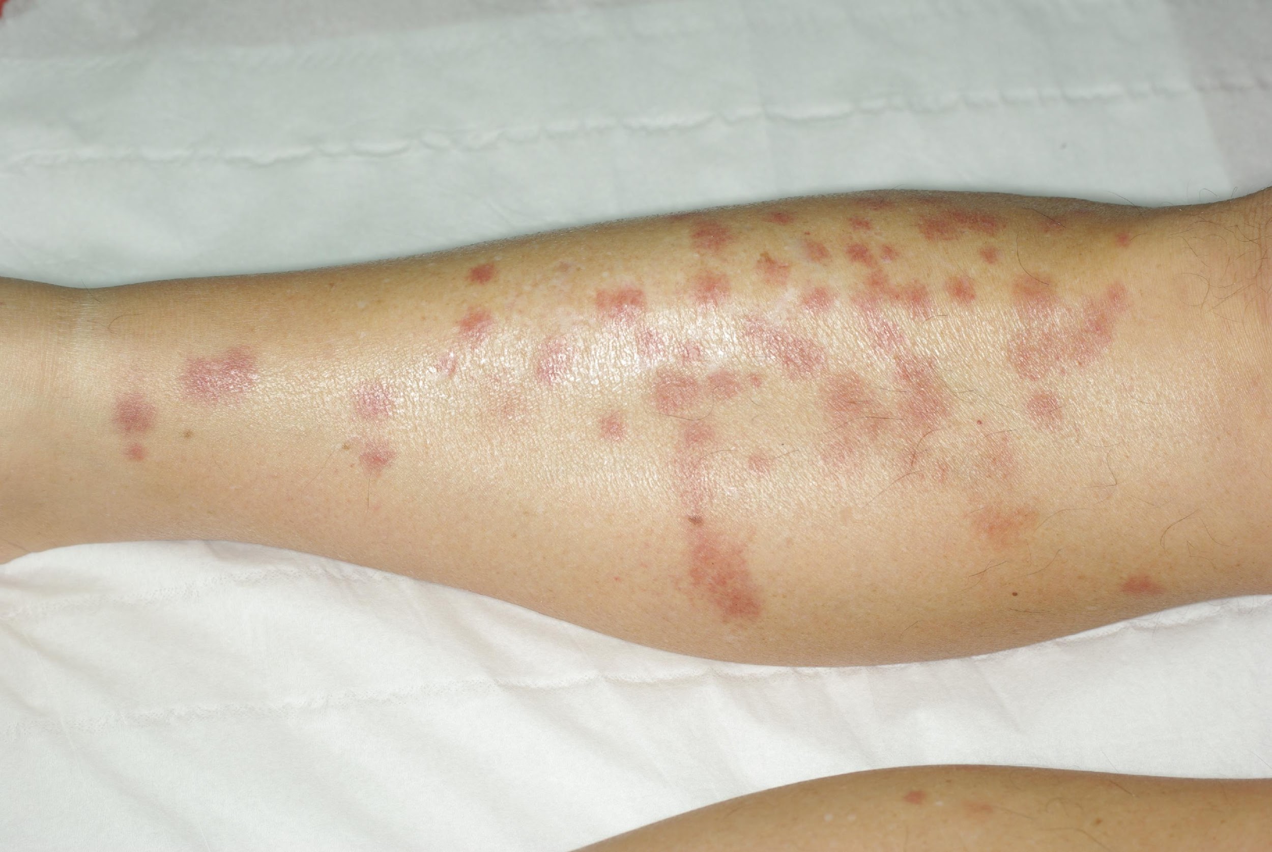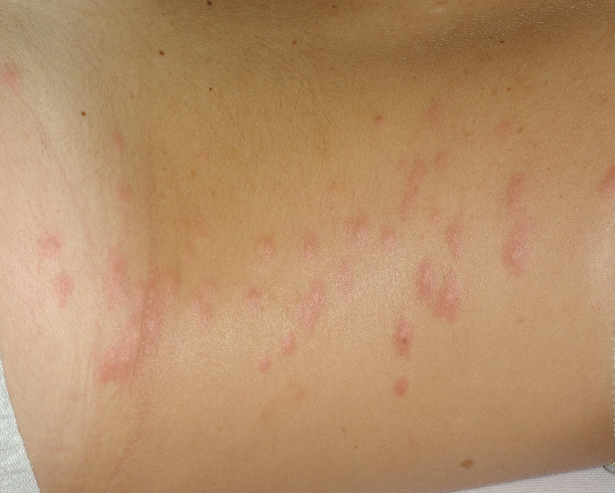 Parfois, l' éruption peut cependant être associée à une réaction systémique (générale) à type d' urticaire voire d' anaphylaxie. À contrario, certaines personnes ne développent pas de lésion, mais peuvent seulement constater de discrètes traces de sang dans le lit.